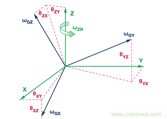 運動控制系統(tǒng)通常會建立慣性參考系,其中包含三個相互垂直90°的軸。這三個軸為MEMS IMU中的各個傳感器提供方位參考。理想情況下,陀螺儀的各個旋轉軸將與系統(tǒng)參考系中的軸完全對齊,將IMU安裝到平臺上之后,其將監(jiān)視運行情況。這種情況下,在慣性參考系中圍繞其中一個軸旋轉,只有該軸的陀螺儀會生成響應。實際操作中,無法實現(xiàn)這種效果,因為機械缺陷必定會造成一些對齊誤差,從而導致離軸陀螺儀響應慣性參考系中圍繞一個軸的旋轉運動。量化此響應需要一些三角恒等式,并謹慎定義陀螺儀的對齊誤差。