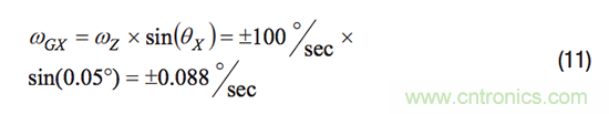 每個陀螺儀的對齊誤差均具有兩個分量,分別定義其相對于慣性參考系中另一個軸的對齊誤差。例如,對于圖2中的系統(tǒng),θXZ代表x軸陀螺儀相對于z軸的對齊誤差。此對齊誤差定義有助于建立公式以計算離軸陀螺儀對系統(tǒng)慣性參考系中圍繞另一個軸旋轉運動的響應。公式9中給出了一個示例,其量化了x軸陀螺儀相對于z軸的對齊誤差(θXZ)和圍繞z軸旋轉(ωZR)而產(chǎn)生的響應(ωGX)。