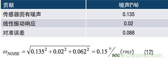 表1總結了ADIS16488A中來自各個因素的陀螺儀噪聲。公式12給出了0.15°/s (rms)的整體噪聲估算值(ωNOISE),表示表1中所有三個噪聲源的平方和根值(RSS)。
