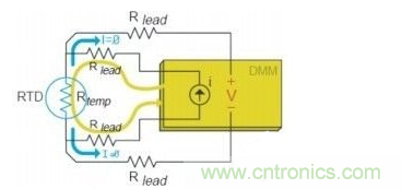 與熱敏電阻相似,鉑電阻溫度傳感器(RTD)也是用鉑制成的熱敏感電阻。當通過測量電壓計算RTD 溫度時,數字萬用表用已知電流源測量該電流源所產生的電壓。這一電壓為兩條引線(Vlead)上的壓降加RTD上的電壓(Vtemp)。例如,常用RTD 的電阻為100Ω,每1℃僅產生0.385Ω的電阻變化。如果每條引線有10Ω電阻,就將造成26℃的測量誤差,這是不可接受的。所以應對RTD作4線歐姆測量。