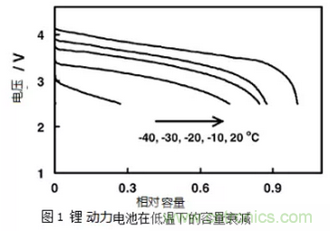 鋰動力電池在不同低溫下的放電容量曲線如圖1所示,與室溫20℃相比,低溫-20℃下容量衰減已經比較明顯,到-30℃是容量損失更多,-40℃下容量連一半都不到了。