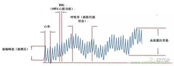 光學心率傳感器可生成測量心率的PPG波形并將該心率數據作為基礎生物計量值,但是利用PPG波形可以測量的對象遠不止于此。盡管很難取得和維護精確的PPG測量結果(我們將在下一篇詳細論述它),但是如果您能夠成功獲得精確的PPG測量結果,它將發揮強大的作用。高品質PPG信號是當今市場需求的大量生物計量的基礎。圖2是經過簡化的PPG信號,該信號代表了多個生物計量的測量結果。