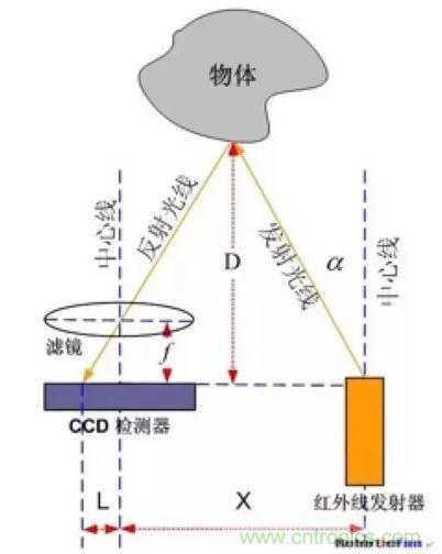 一般的紅外測距都是采用三角測距的原理。紅外發(fā)射器按照一定角度發(fā)射紅外光束,遇到物體之后,光會反向回來,檢測到反射光之后,通過結構上的幾何三角關系,就可以計算出物體距離D。