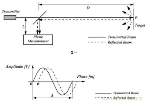 比較簡單的方案是測量反射光的相移,傳感器以已知的頻率發(fā)射一定幅度的調制光,并測量發(fā)射和反向信號之間的相移,如上圖一。調制信號的波長為lamda=c/f,其中c是光速,f是調制頻率,測量到發(fā)射和反射光束之間的相移差theta之后,距離可由lamda*theta/4pi計算得到,如上圖二。