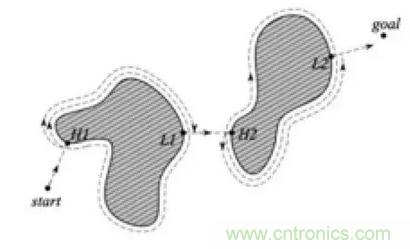 Bug算法應該是最簡單的一種避障算法了,它的基本思想是在發(fā)現障礙后,圍著檢測到的障礙物輪廓行走,從而繞開它。Bug算法目前有很多變種, 比如Bug1算法,機器人首先完全地圍繞物體,然后從距目標最短距離的點離開。Bug1算法的效率很低,但可以保證機器人達到目標。