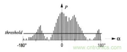 它執(zhí)行過程中針對移動機器人當前周邊環(huán)境創(chuàng)建了一個基于極坐標表示的局部地圖,這個局部使用柵格圖的表示方法,會被最近的一些傳感器數據所更新。VFH算法產生的極坐標直方圖如圖所示: