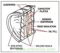 差動電容式壓力傳感器的受壓膜片電極位于兩個固定電極之間,構成兩個電容器。在壓力的作用下一個電容器的容量增大而另一個則相應減小,測量結果由差動式電路輸出。它的固定電極是在凹曲的玻璃表面上鍍金屬層而制成。過載時膜片受到凹面的保護而不致破裂。差動電容式壓力傳感器比單電容式的靈敏度高、線性度好,但加工較困難(特別是難以保證對稱性),而且不能實現對被測氣體或液體的隔離,因此不宜于工作在有腐蝕性或雜質的流體中。