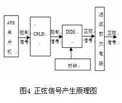 采用DDS技術在當前的測試測量行業(yè)已是一種主流的做法,其頻率精度可隨相位累加器的位數而定。本系統采用單片機+專用DDS芯片的方式產生正弦信號,其原理如圖4所示,ARM單片機向CPLD 發(fā)出控制命令,CPLD 在時鐘下譯碼后產生DDS的控制信號,產生出相應頻率的正弦波信號,該正弦信號經過濾波放大后,輸出相應幅值的正弦信號。