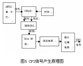 曲軸位置信號(CPS)是PCM控制點火系統中最主要的傳感器信號,為適應多種PCM的需求,設計采用CPLD和DA的方式產生。CPS信號產生原理如圖5所示,在EPROM中存有一個周期的正弦表數據,當需要產生 CPS信號時,ARM單片機對CPLD進行設置,CPLD根據接收的控制命令,通過時鐘計數,產生讀存儲器的信號,并向EPROM提供合適的地址信號和控制信號,EPROM輸出相應地址的數據,經D/A轉換,變成單端CPS模擬信號,然后經濾波電路和單端轉差分處理電路,輸出CPS差分信號。在實際的電路實現中,對CPS信號的控制可由計算機通過CAN總線向ARM發(fā)出控制命令進行設置,因此,即使ARM芯片在運行過程中復位,電路仍能輸出正確的CPS信號,以確保測試周期的正常進行。